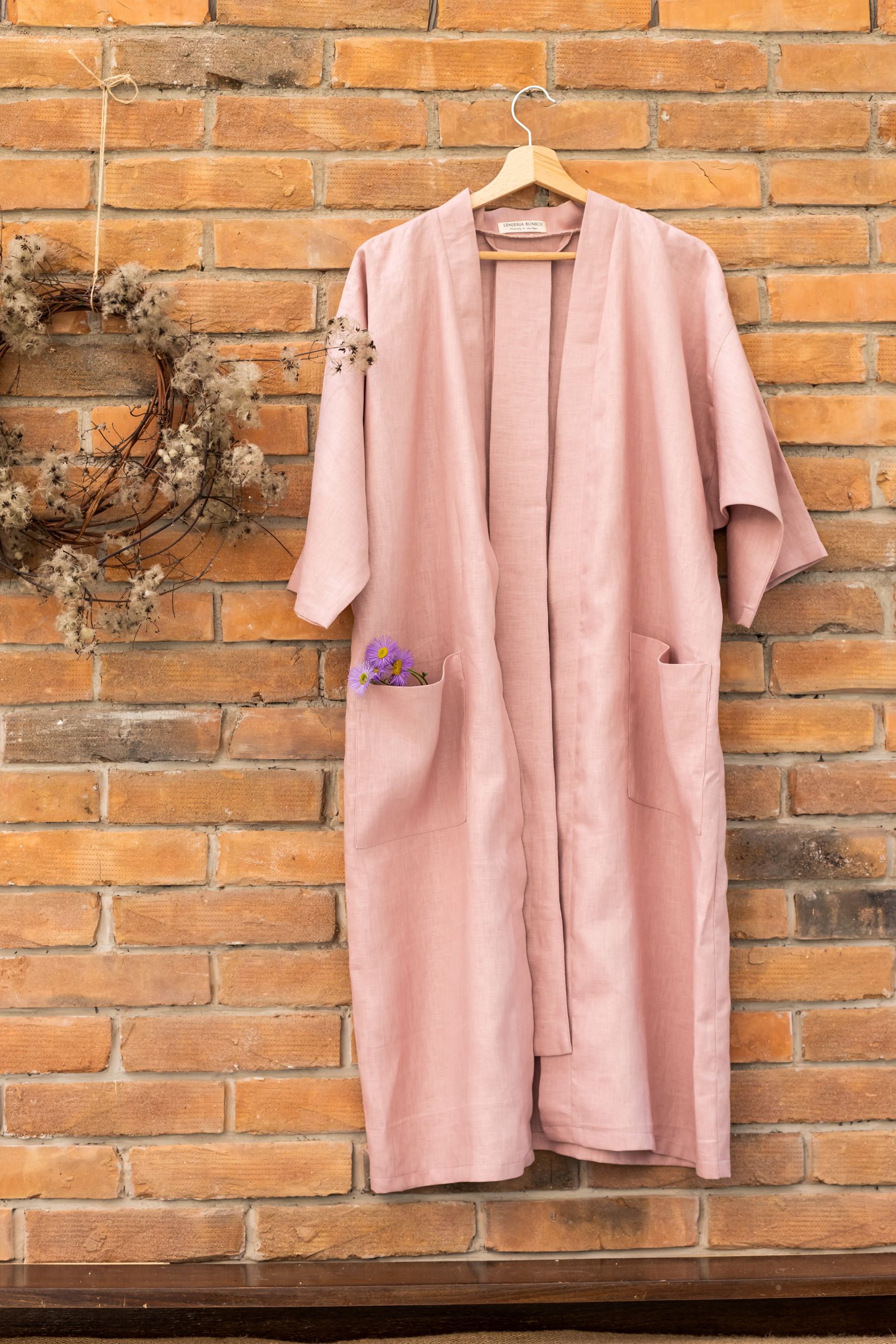 Kimono-ul este o piesă atemporală, ce nu ar trebui să lipsească din garderoba nici unei femei. Este perfect de luat în vacanță la mare, ca ținută lejeră de casă, dar și pentru o zi însorită de vară când îl puteți accesoriza cu un maieu de mătase și pantaloni din in. Kimono-ul are un croi drept, simplu, pentru o ținută feminină și delicată. Este prevăzut cu 2 buzunare mari și un cordon detașabil.