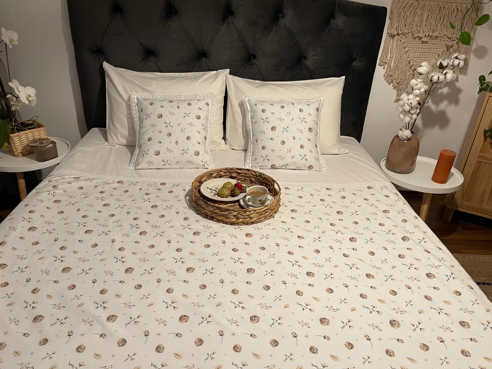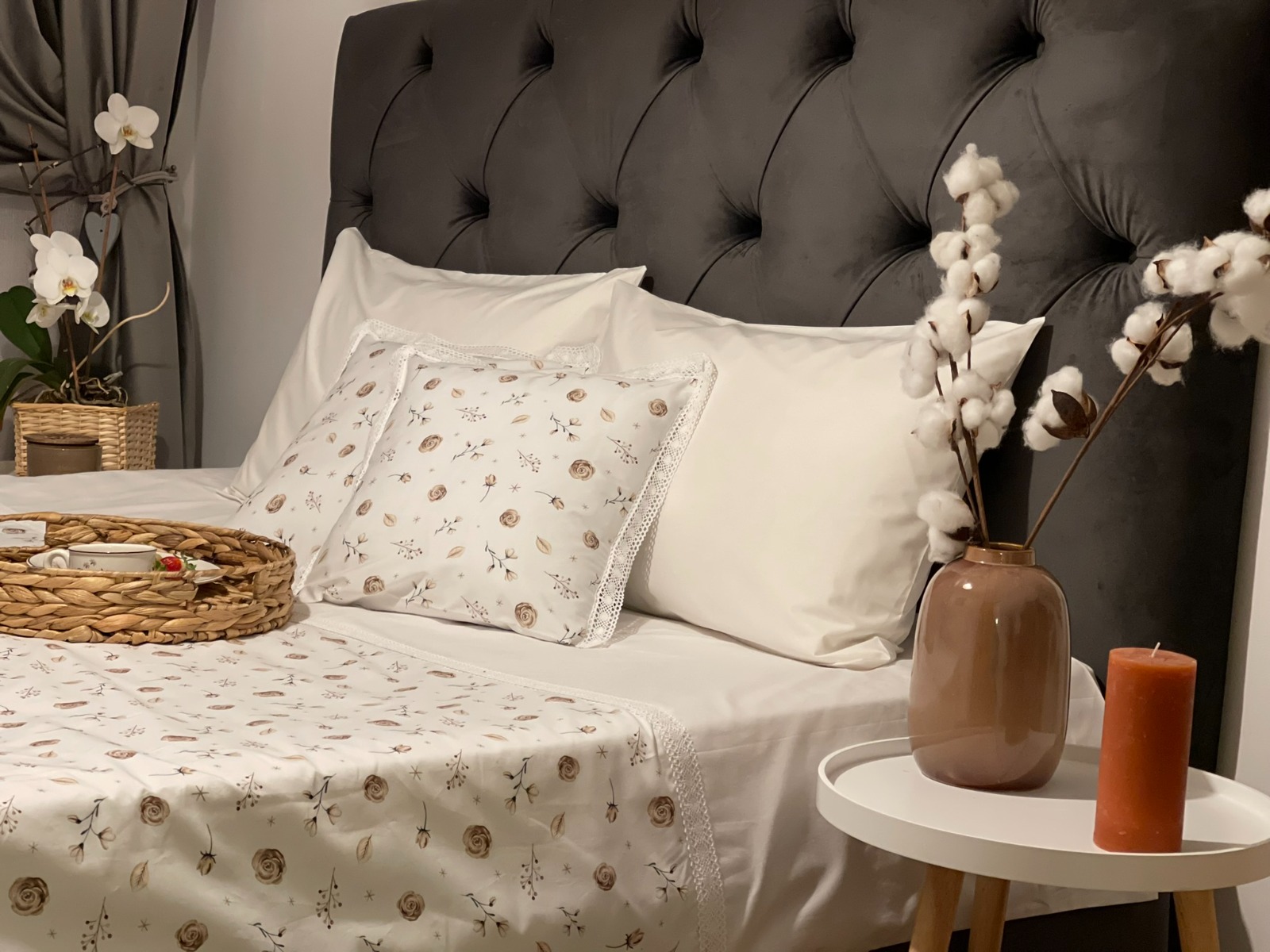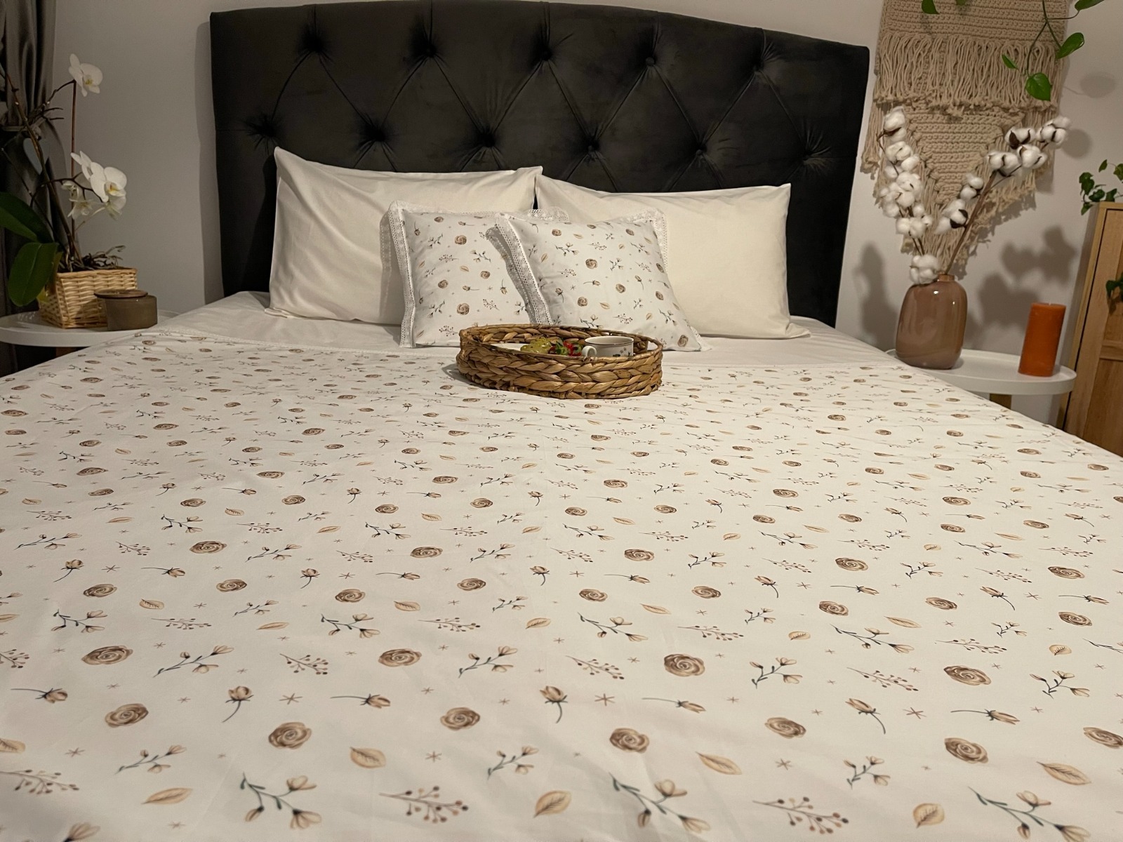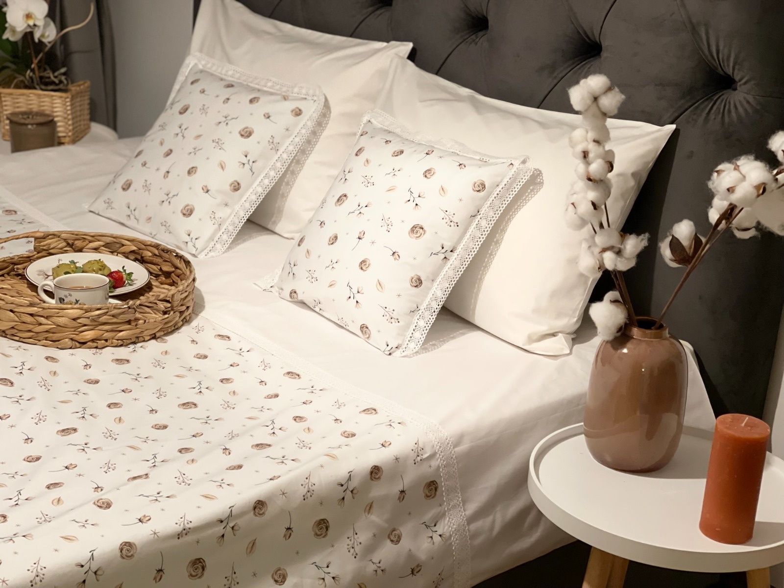 Culorile calde si pastelate ale imprimeului cu trandafiri combinate cu albul imaculat transformă așternutul într-unul cu farmec oferindu-i un design unic care se va face remarcat în casele voastre.