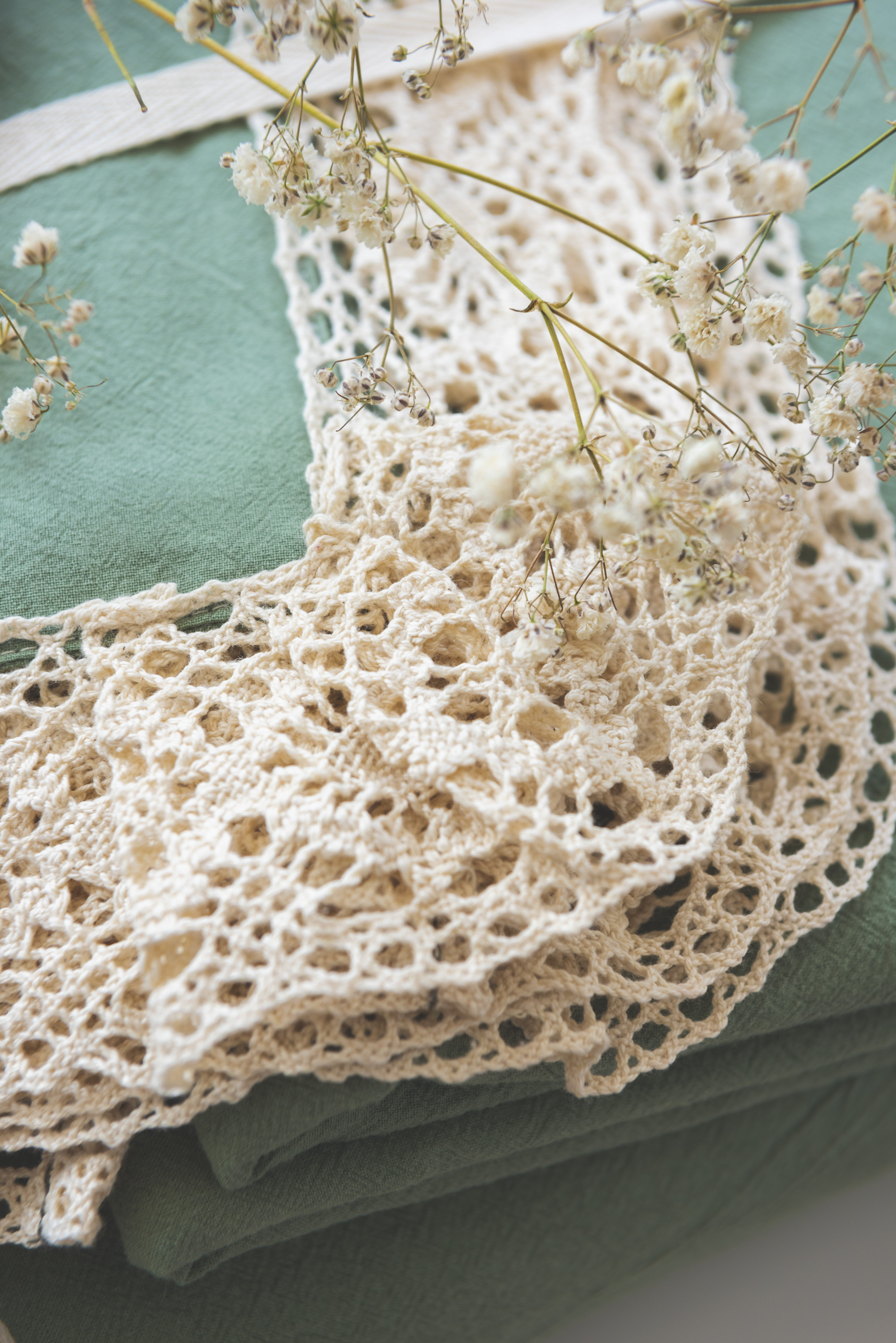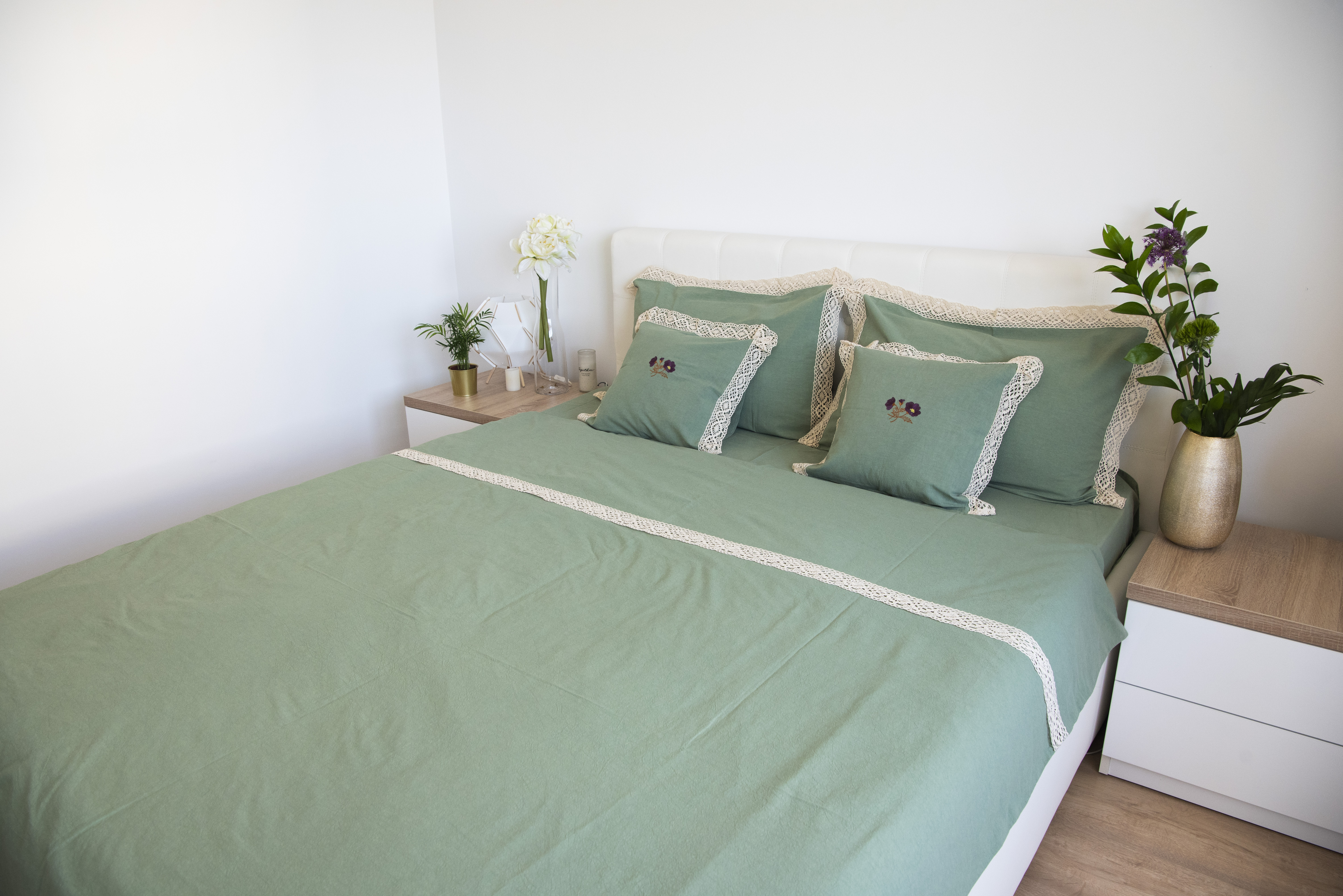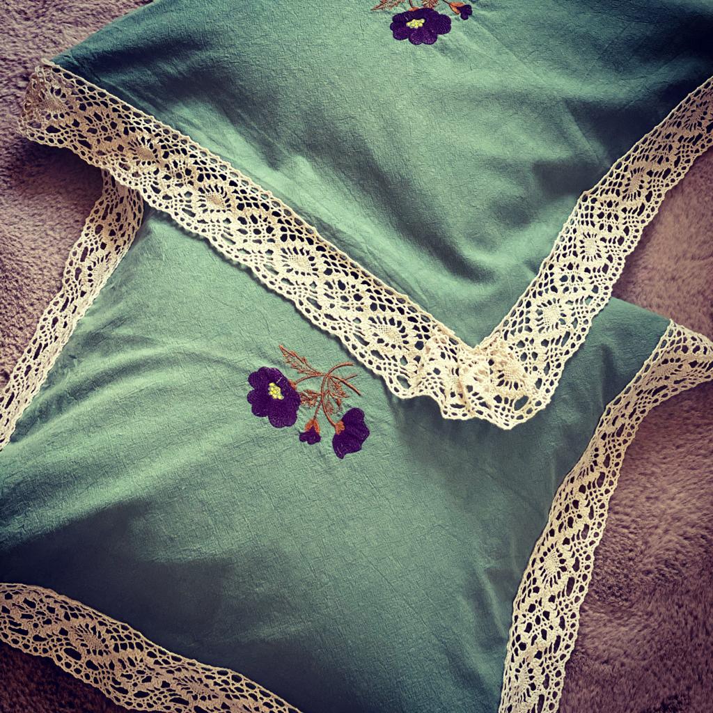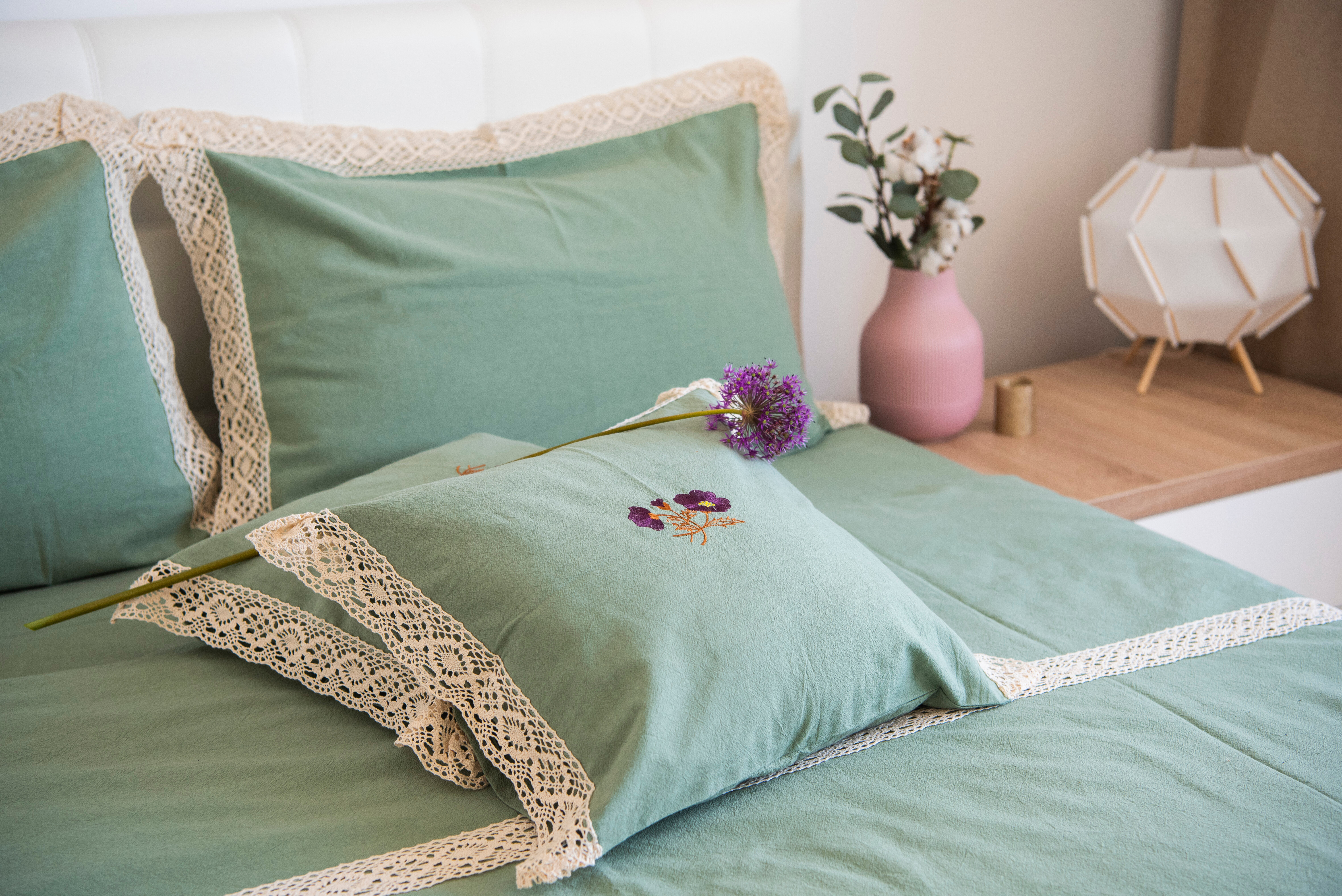 Realizată din cel mai moale și delicat bumbac, o pânză naturală premium îmbogățită cu aer, care lasă pielea să respire ușor și care asigură confort termic 4 anotimpuri. Această pânză a fost realizată folosind Air Soft Tehnology, o tehnologie autentică românească abordând vechile tehnici de țesere în casă și de finisare a pânzelor la râu și la soare. Verdele primăveratic, motivele brodate pe fețele de pernă și dantelă oferă în plus acestei pânze minunate eleganță și prospețime.