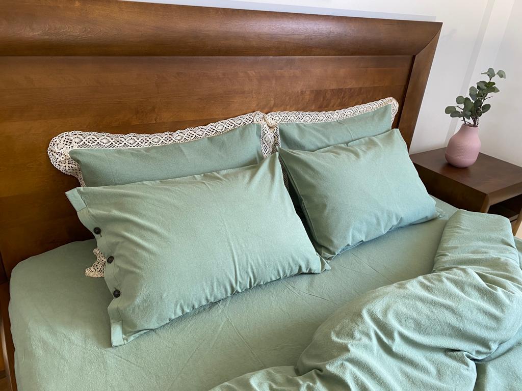 Realizată din cel mai moale și delicat bumbac, o pânză naturală premium îmbogățită cu aer, care lasă pielea să respire ușor și care asigură confort termic 4 anotimpuri. Această pânză a fost realizată folosind Air Soft Tehnology, o tehnologie autentică românească abordând vechile tehnici de țesere în casă și de finisare a pânzelor la râu și la soare. Verdele primăveratic oferă în plus acestei pânze minunate eleganță și prospețime.