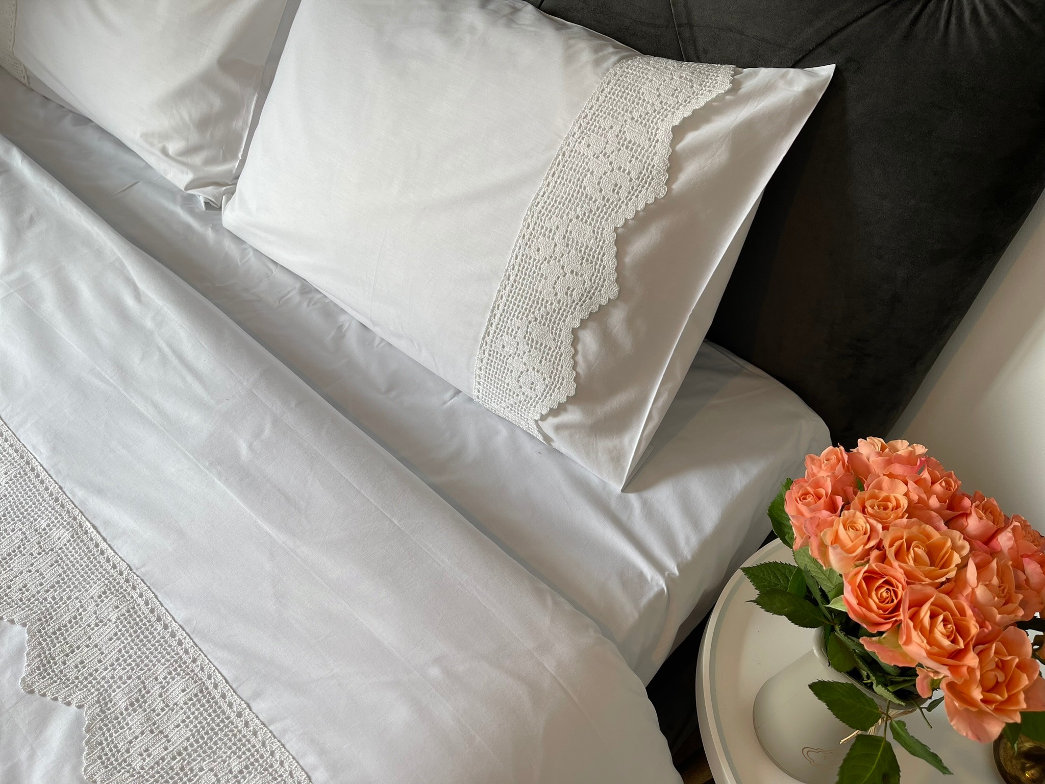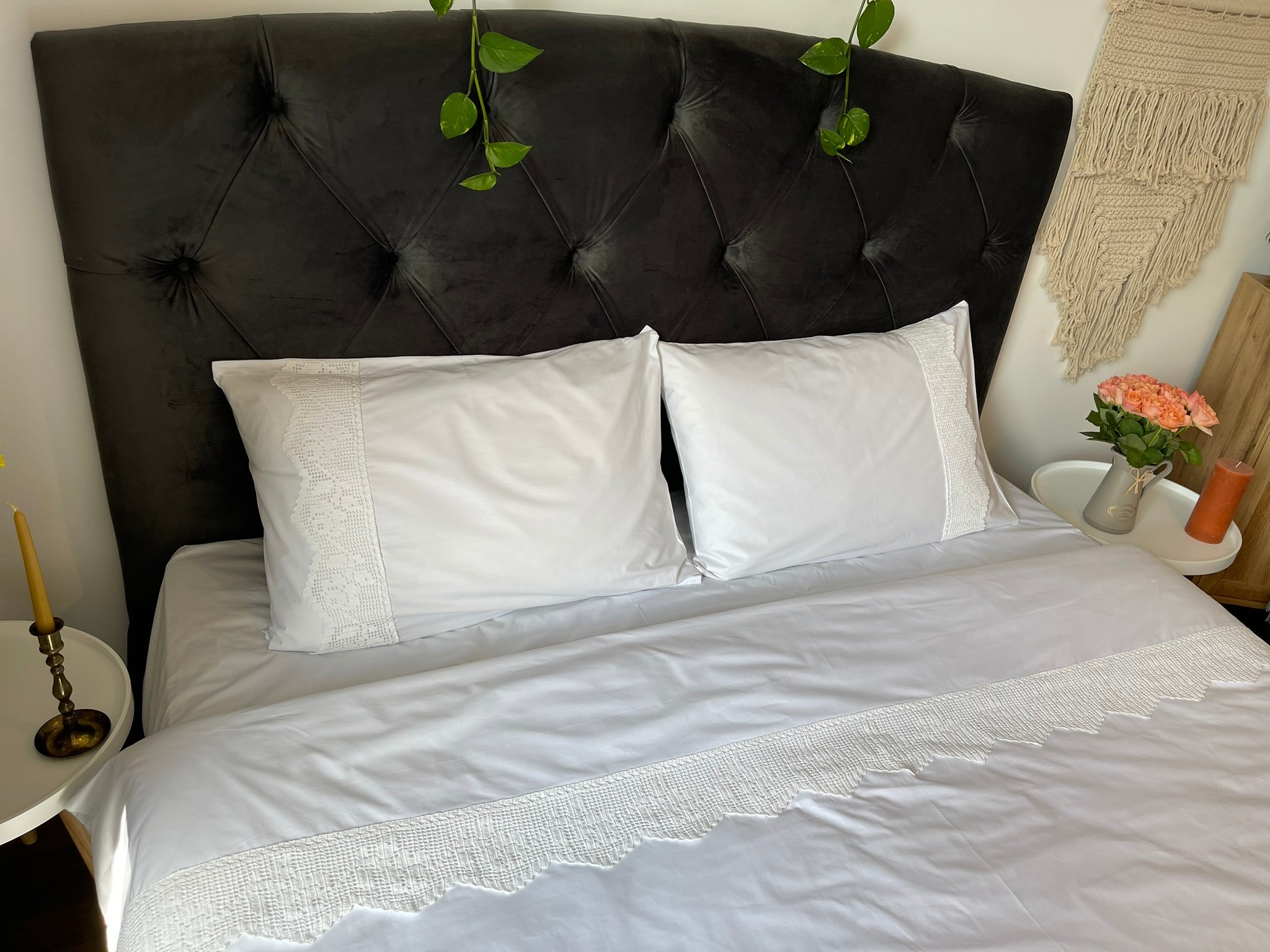 Realizată din cel mai calitativ bumbac percale, o lenjerie de pat naturală, cu un aer imaculat, inspirată din așternuturile de odinioară țesute la război. Accesorizată cu nasturi de lemn și o dantelă deosebită împletită manual, având un model tradițional inspirat din folclorul românesc.